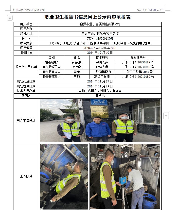 自贡市量子金属制造有限公司职业病危害因素定期检测