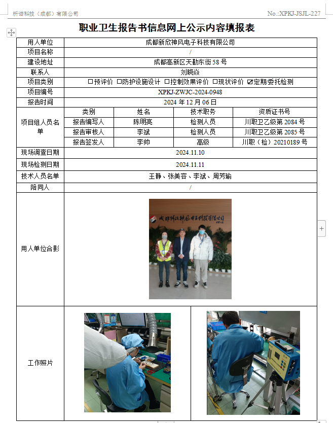 成都新欣神风电子科技有限公司职业病危害因素定期检测