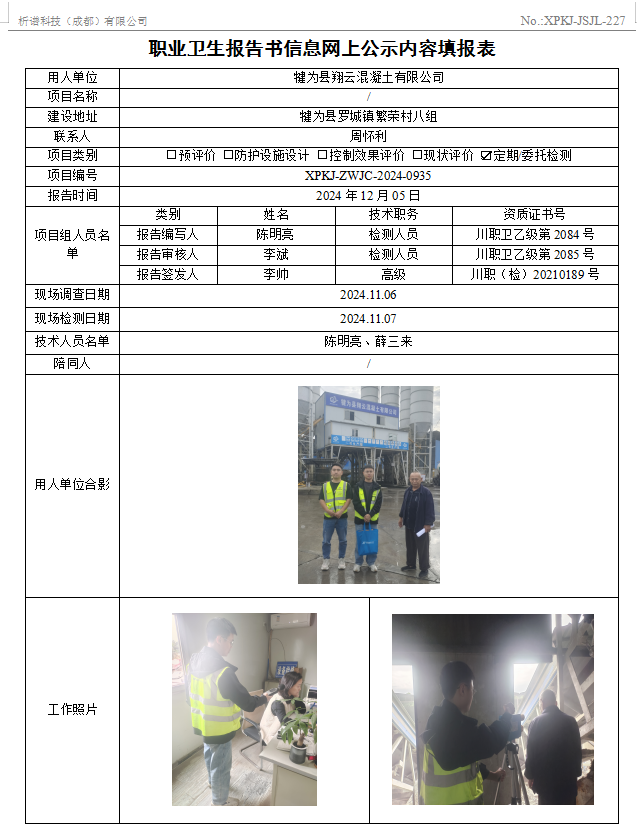犍为县翔云混凝土有限公司职业病危害因素定期检测