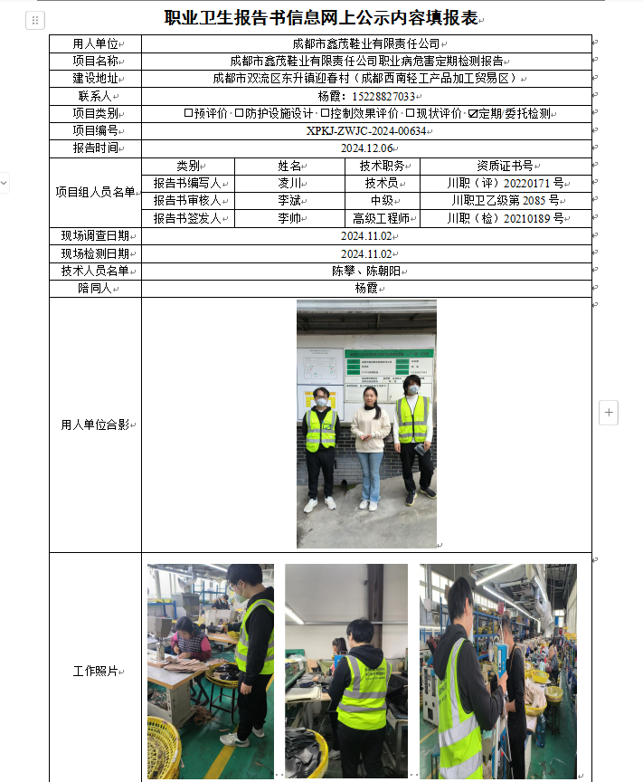 成都市鑫茂鞋业有限责任公司职业病危害因素定期检测 定期检测