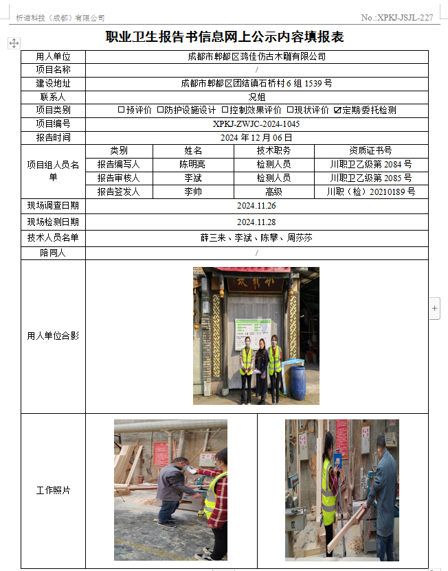 成都市郫都区鸿佳仿古木雕有限公司职业病危害因素定期检测