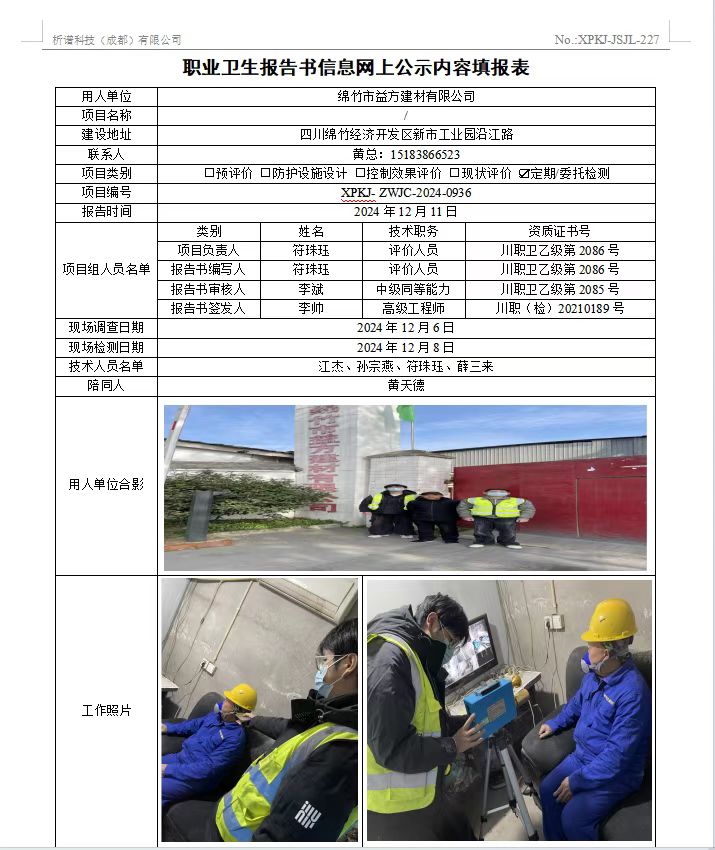 绵竹市益方建材有限公司职业病危害因素定期检测
