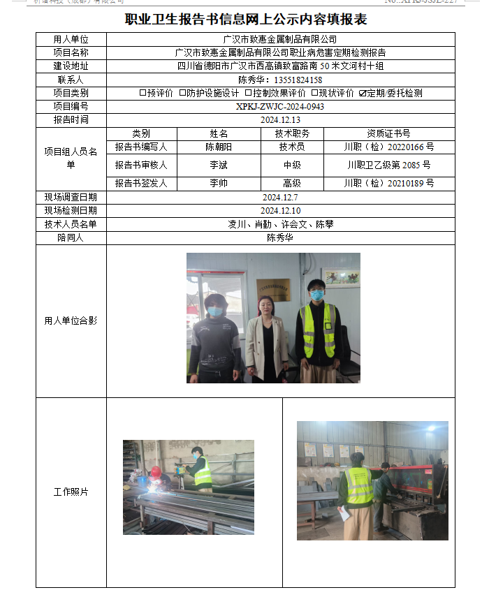 广汉市致惠金属制品有限公司职业病危害因素定期检测