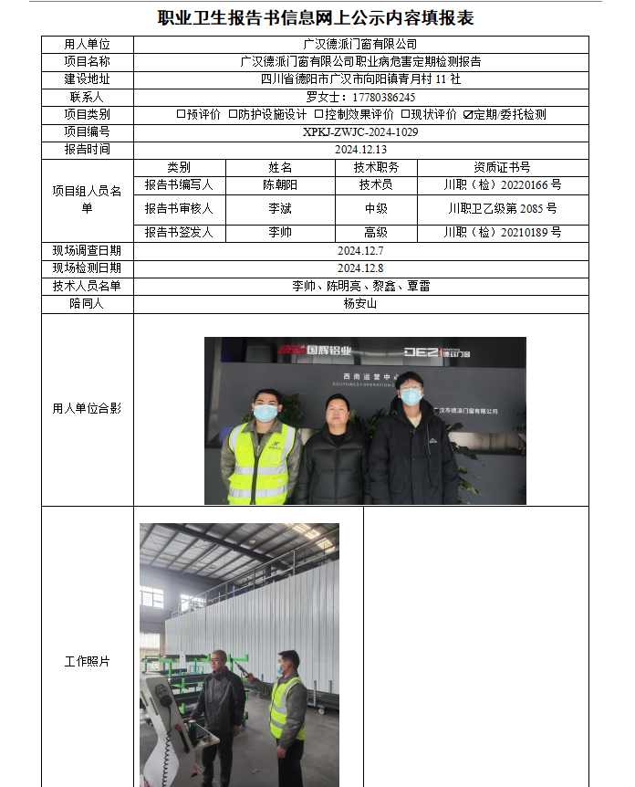 四川帝顿门窗有限公司职业病危害因素定期检测