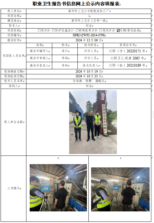 崇州市上元小中纸制品加工厂职业病危害因素定期检测