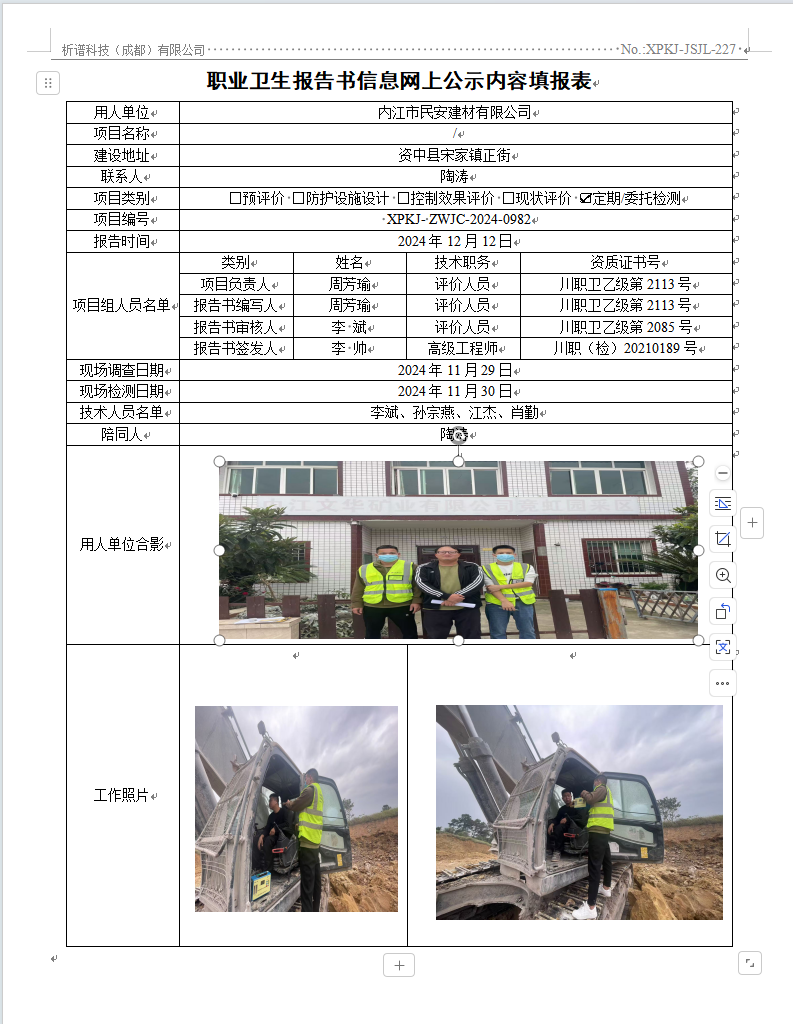 内江市民安建材有限公司职业病危害因素定期检测