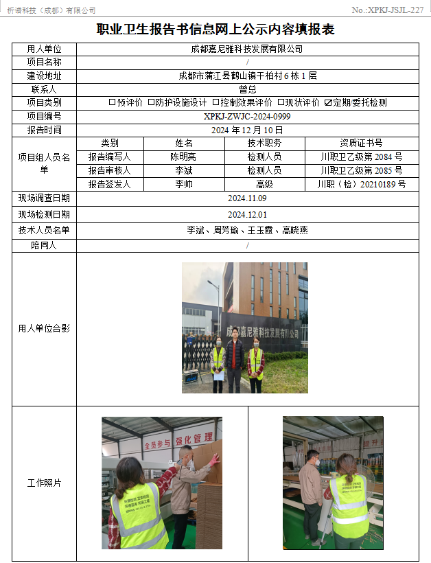 成都嘉尼雅科技发展有限公司职业病危害因素定期检测