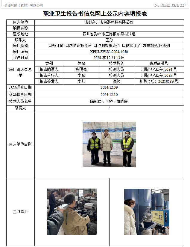 成都兴川成包装材料有限公司职业病危害因素定期检测