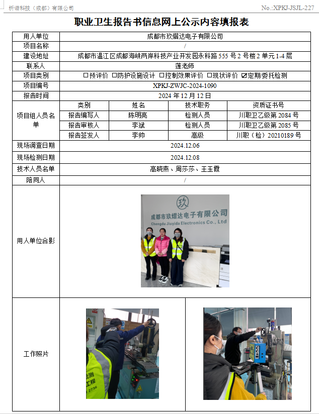成都市玖熠达电子有限公司职业病危害因素定期检测