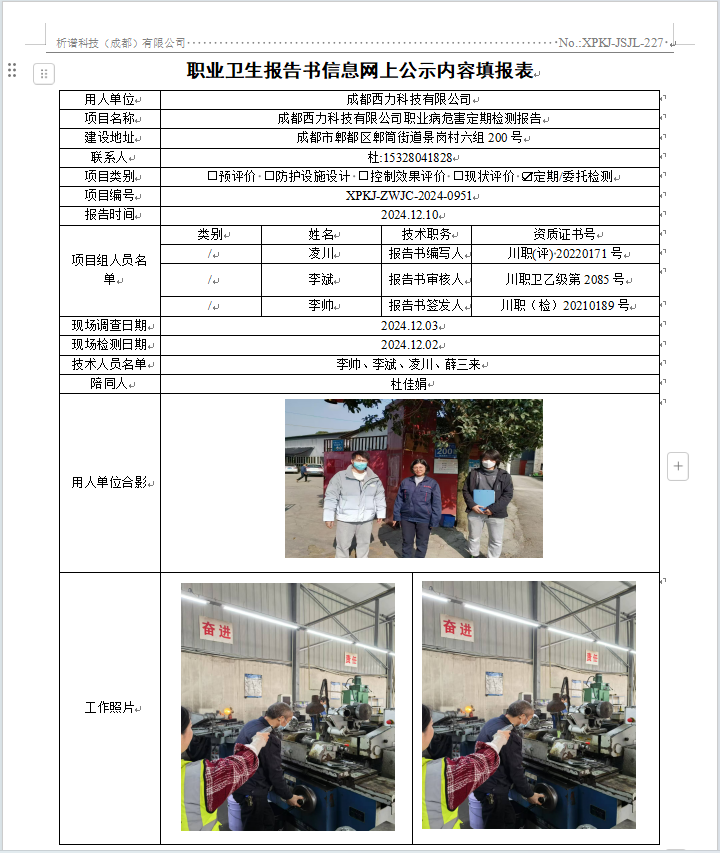 成都嘉尼雅科技发展有限公司职业病危害因素定期检测