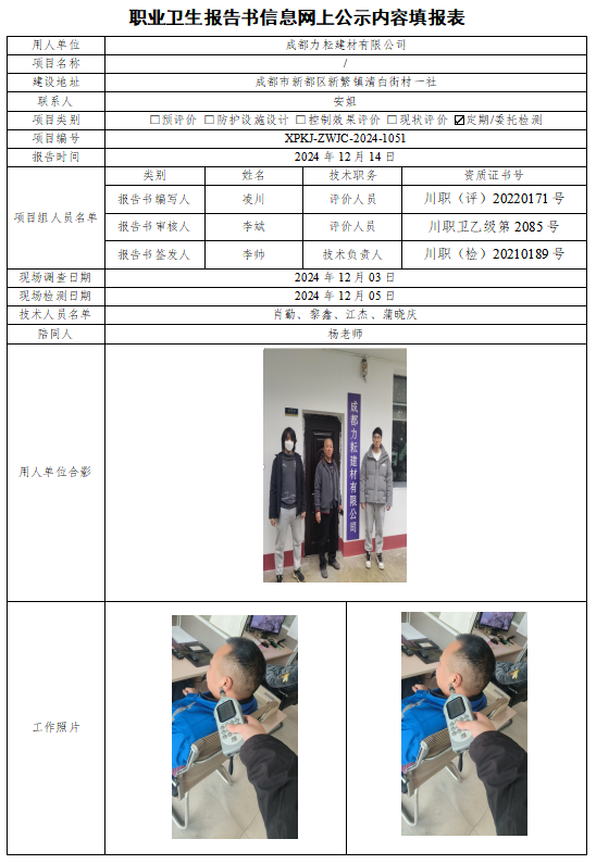 成都力耘建材有限公司职业病危害因素定期检测