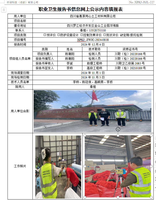 四川省惠源同心土工材料有限公司职业病危害因素定期检测