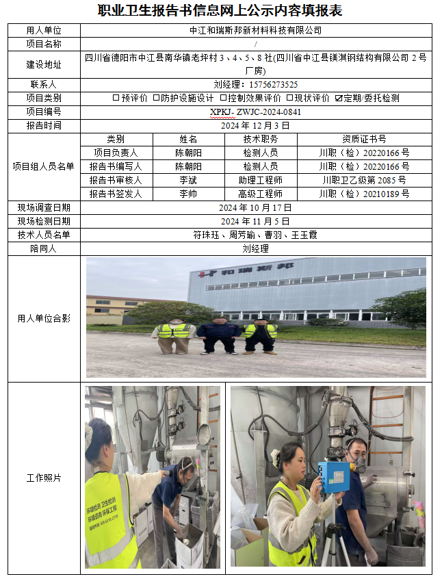 中江和瑞斯邦新材料科技有限公司职业病危害因素定期检测