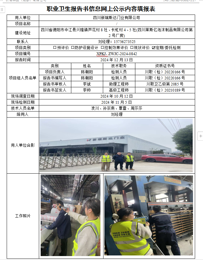 四川新瑞斯达门业有限公司职业病危害因素定期检测