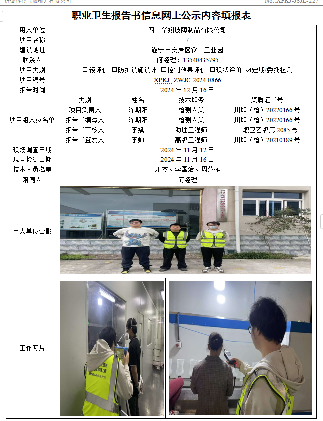 四川华翔玻陶制品有限公司职业病危害因素定期检测