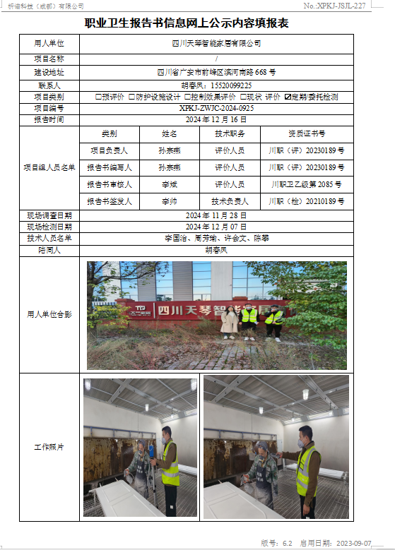四川天琴智能家居有限公司职业病危害因素定期检测