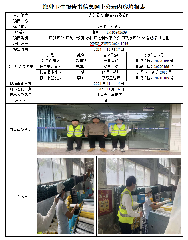 大英县天骄纺织有限公司职业病危害因素定期检测