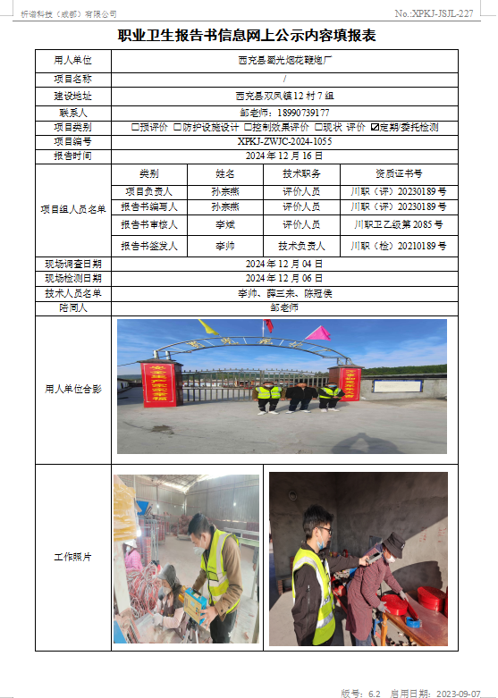 西充县蜀光烟花鞭炮厂职业病危害因素定期检测