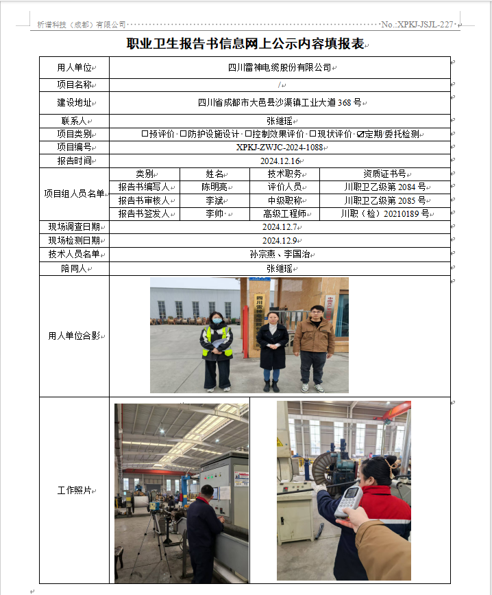 四川雷神电缆股份有限公司职业病危害因素定期检测