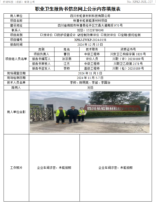 四川长虹新材料科技有限公司职业病危害因素控制效果评价