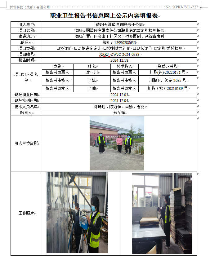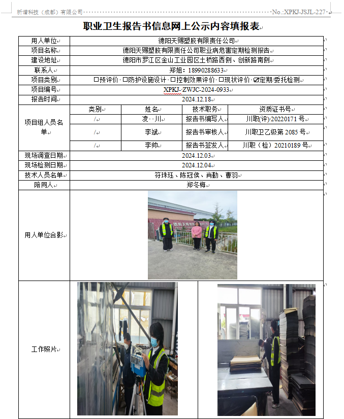 德阳天赐塑胶有限责任公司职业病危害因素定期检测