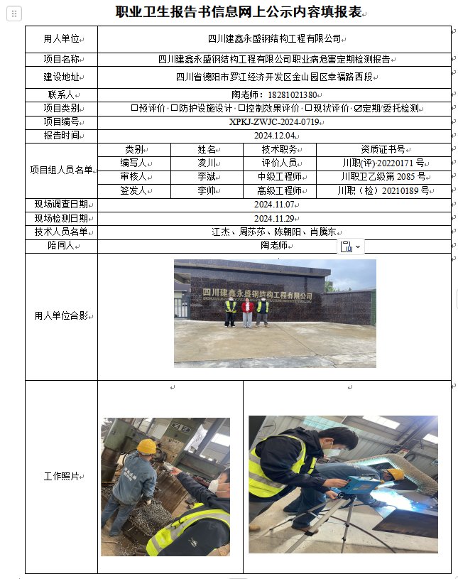 四川建鑫永盛钢结构工程有限公司职业病危害因素定期检测