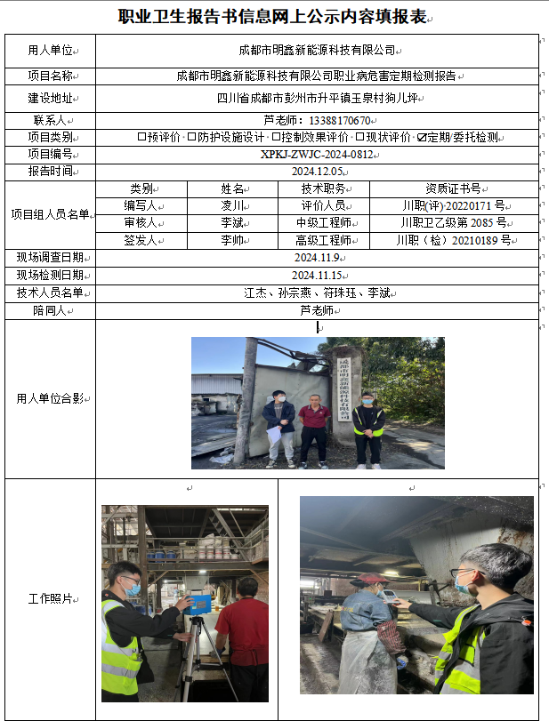 成都市明鑫新能源科技有限公司职业病危害因素定期检测