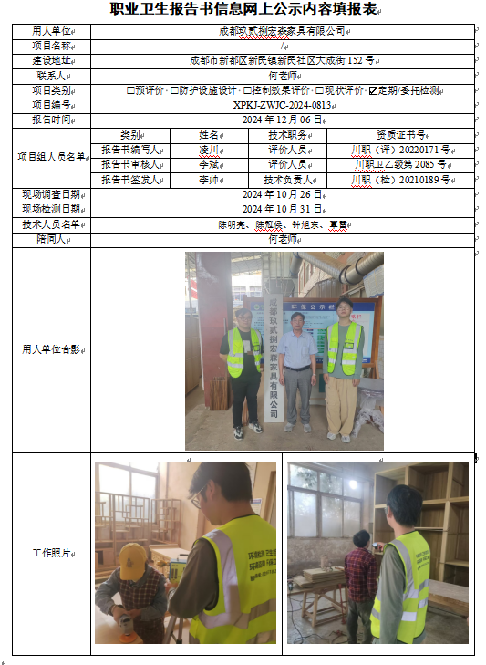 四川佰瑞幸福家具有限公司职业病危害因素定期检测