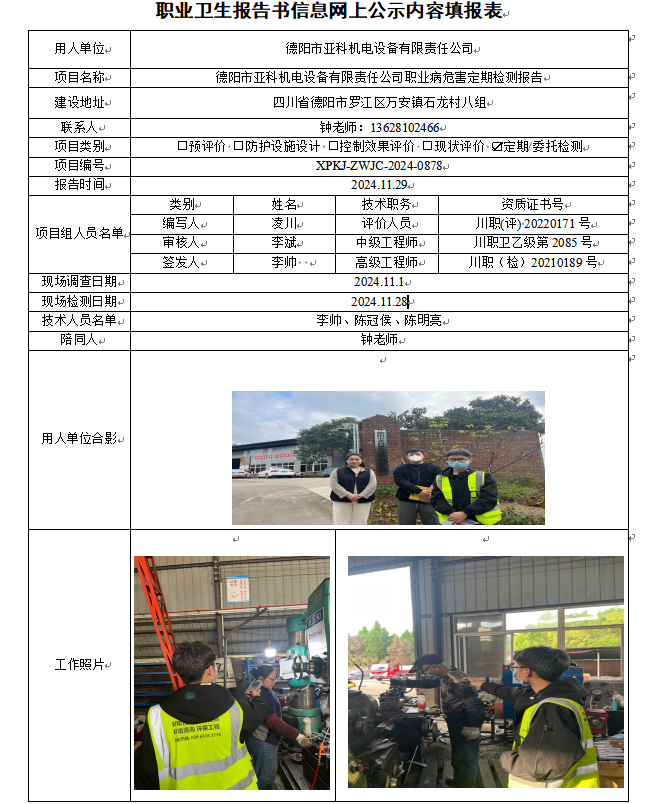 德阳市亚科机电设备有限责任公司职业病危害因素定期检测