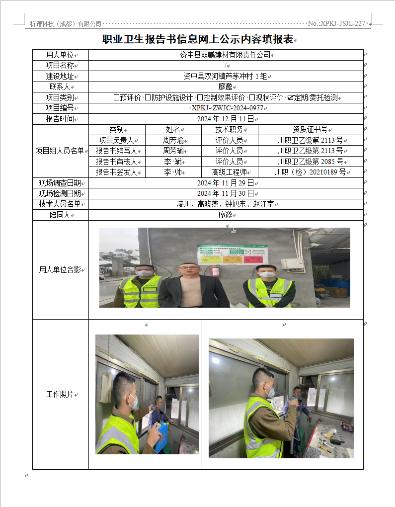 资中县双鹏建材有限责任公司职业病危害因素定期检测