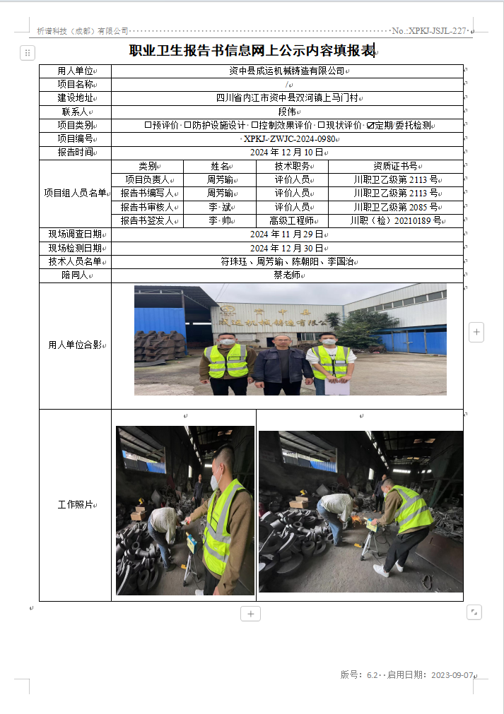 资中县成运机械铸造有限公司职业病危害因素定期检测