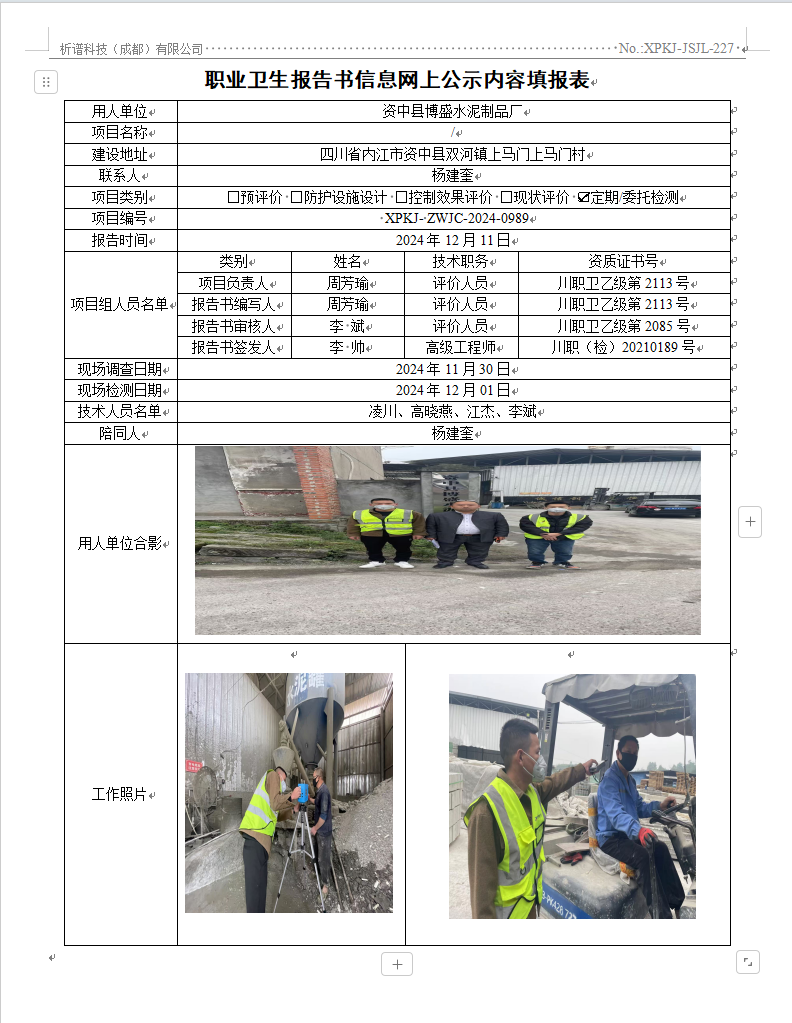 资中县博盛水泥制品厂职业病危害因素定期检测