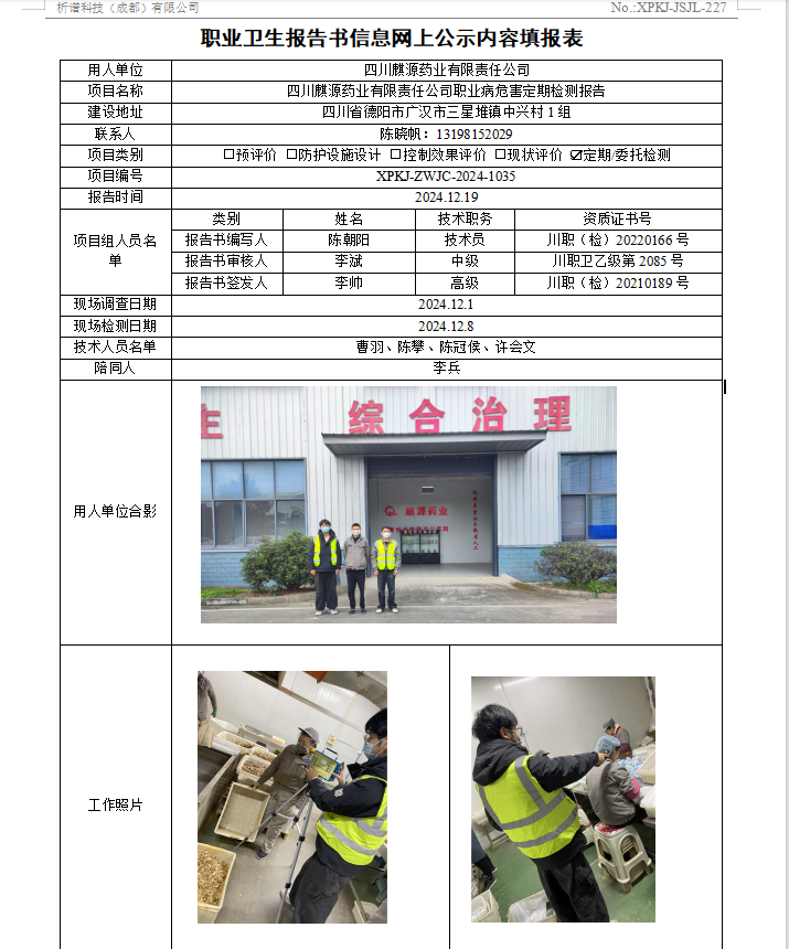 四川麒源药业有限责任公司职业病危害因素定期检测