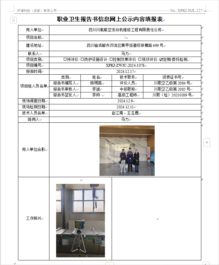 四川川航航空发动机维修工程有限责任公司职业病危害因素定期检测