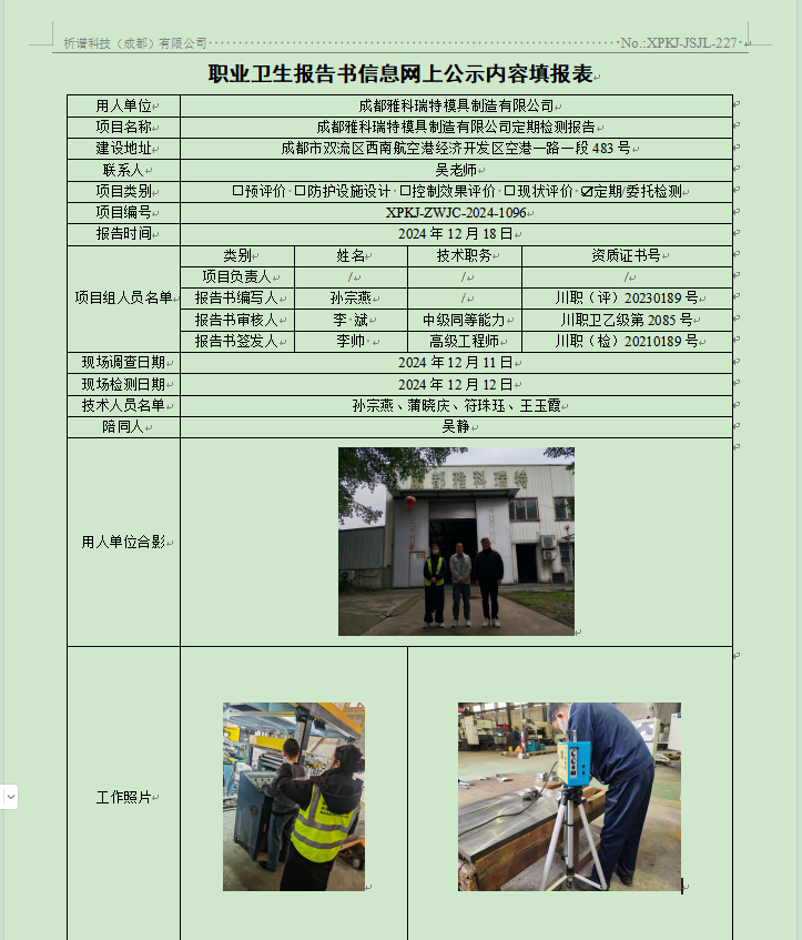 成都雅科瑞特模具制造有限公司职业病危害因素定期检测