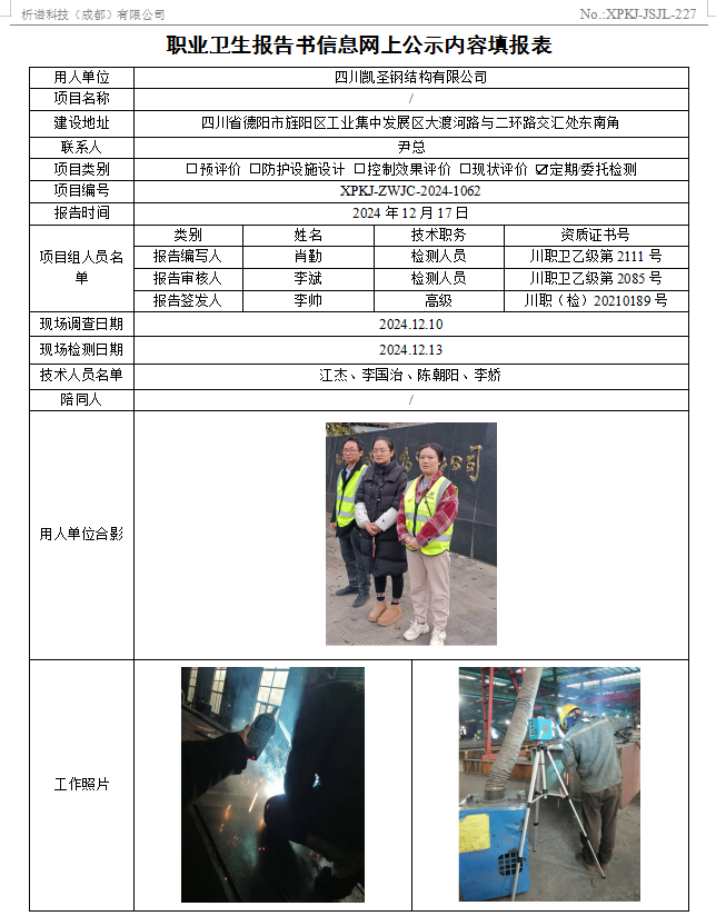 四川凯圣钢结构有限公司职业病危害因素定期检测