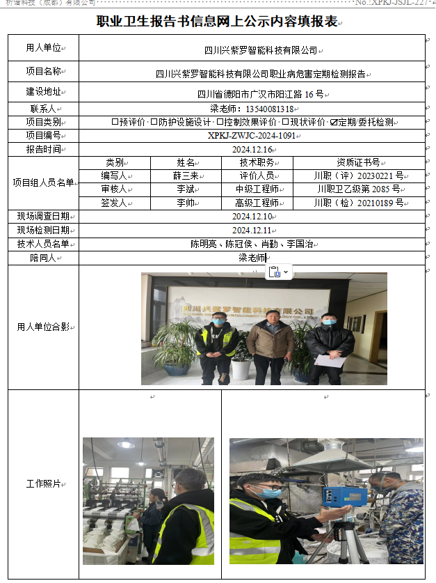 四川兴紫罗智能科技有限公司职业病危害因素定期检测