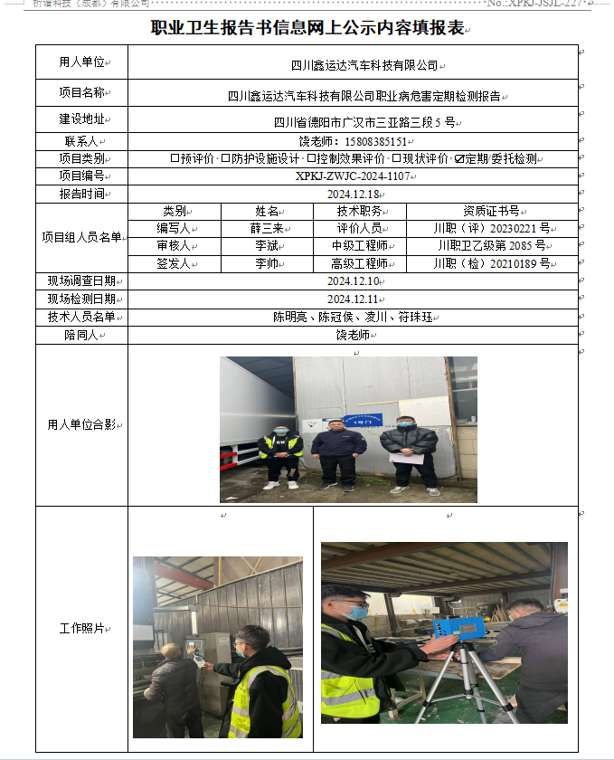 四川鑫运达汽车科技有限公司职业病危害因素定期检测