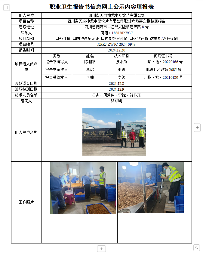 四川省天府神龙中药饮片有限公司职业病危害因素定期检测