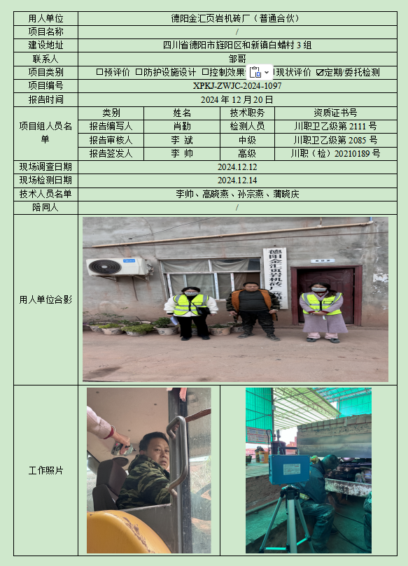 德阳金汇页岩机砖厂(普通合伙)职业病危害因素定期检测