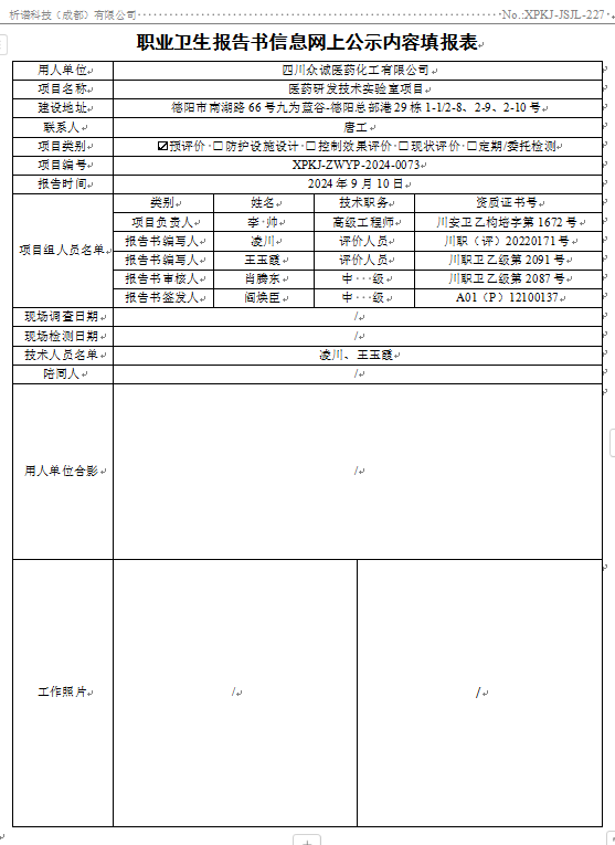 四川众诚医药化工有限公司职业病危害因素预评价
