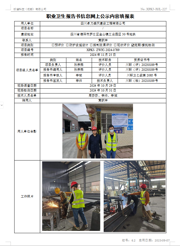 四川卓力盛天建设工程有限公司职业病危害因素定期检测