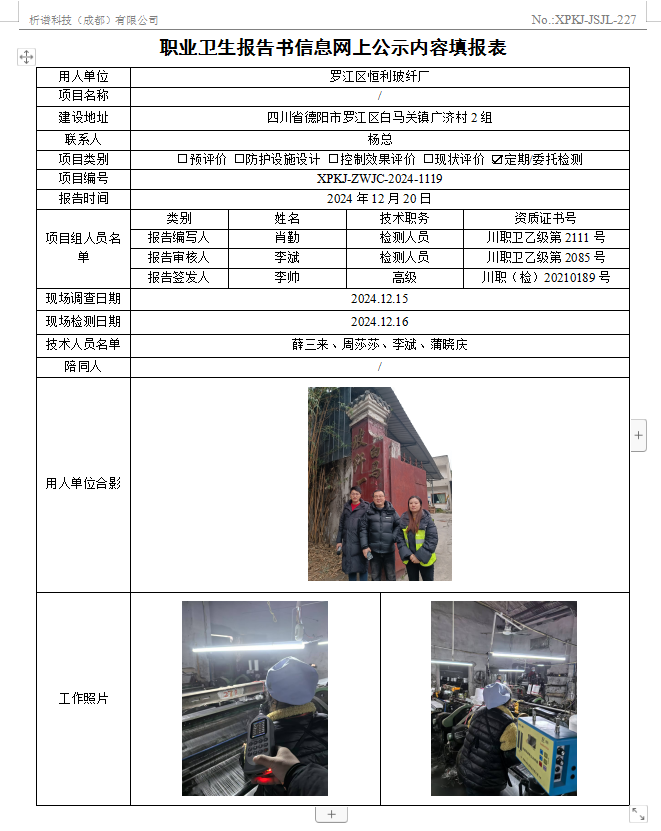 罗江区恒利玻纤厂职业病危害因素定期检测
