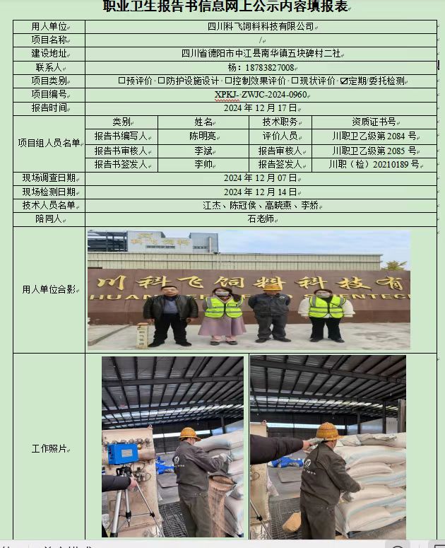 四川科飞饲料科技有限公司职业病危害因素定期检测