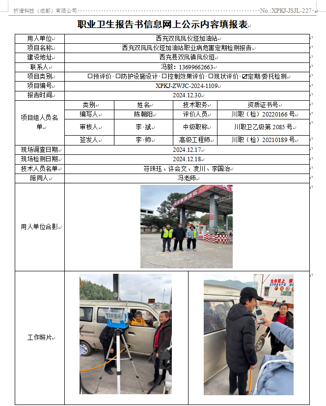 西充双凤凤仪垭加油站职业病危害因素定期检测