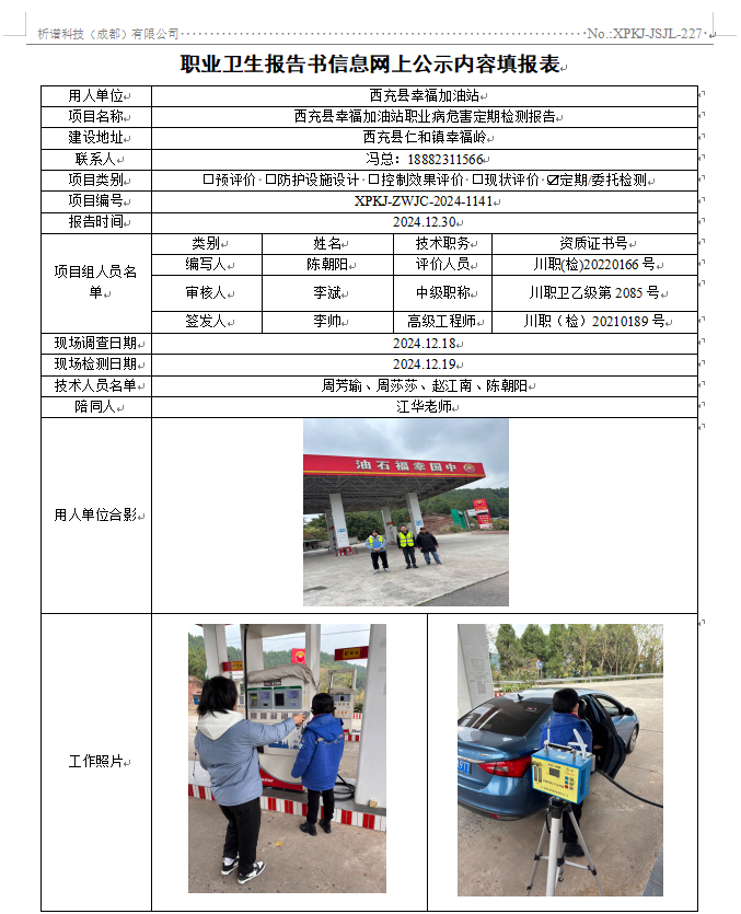 西充双凤凤仪垭加油站职业病危害因素定期检测