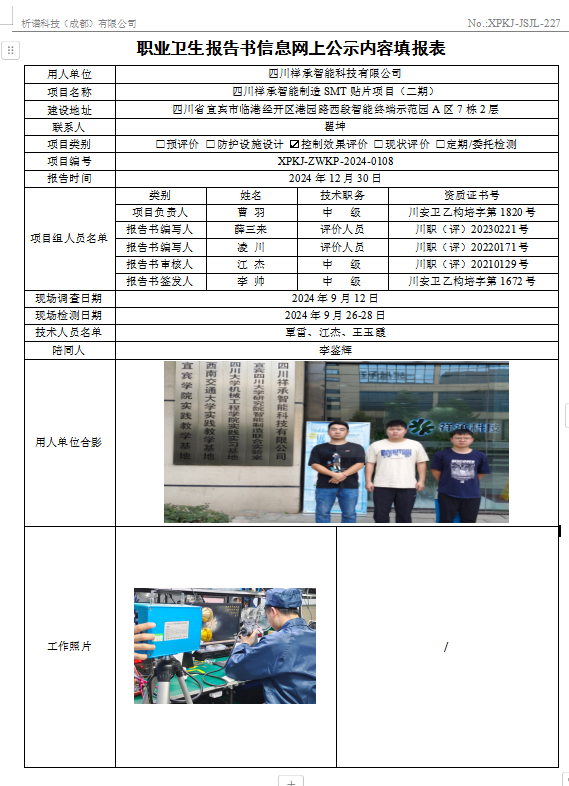 四川祥承智能科技有限公司职业病危害因素控制效果评价
