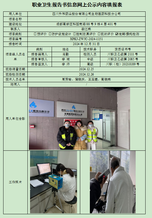 四川升和药业股份有限公司生物医药科技分公司职业病危害因素定期检测