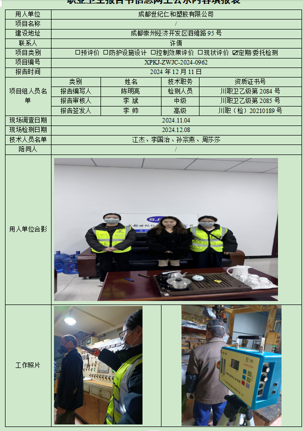 成都世纪仁和塑胶有限公司职业病危害因素定期检测