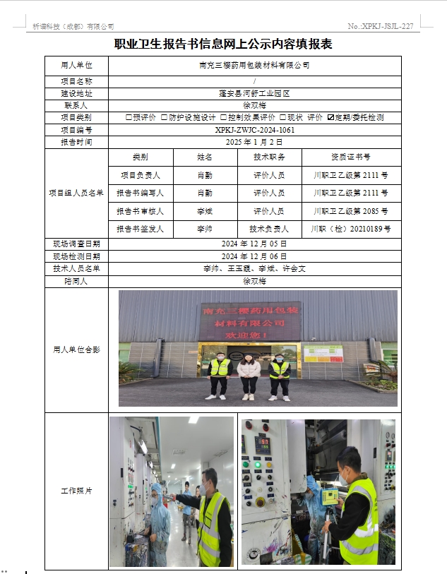 南充三樱药用包装材料有限公司职业病危害因素定期检测